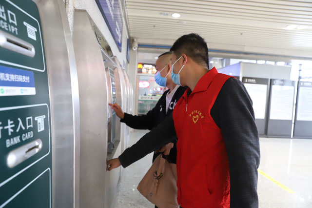 (指導(dǎo)旅客在自動(dòng)售票機(jī)上取票)