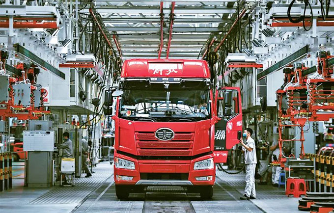 企業(yè)強(qiáng)則國家強(qiáng),加快建設(shè)世界一流企業(yè)是全面建設(shè)社會主義現(xiàn)代化國家的重大任務(wù),是新時代國有企業(yè)的戰(zhàn)略目標(biāo)。近來,一汽解放集團(tuán)股份有限公司生產(chǎn)按下“加速鍵”。圖為2022年6月15日,工人在位于吉林長春的一汽解放總裝車間內(nèi)裝配車輛。 新華社記者 許暢/攝