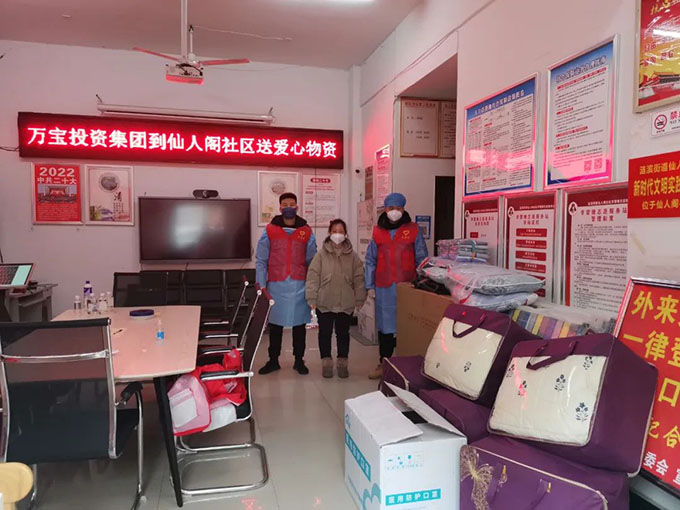 12月1日,萬(wàn)寶投資集團(tuán)黨員志愿者到金色桃園小區(qū)助力疫情防控工作,與社區(qū)工作人員一同維護(hù)現(xiàn)場(chǎng)秩序,并向小區(qū)居民宣傳疫情防控知識(shí)。12月3日,萬(wàn)寶投資集團(tuán)開展“黨員進(jìn)社區(qū)、服務(wù)在基層”活動(dòng),把N95口罩、被褥、枕頭和折疊床等一批愛心防疫物資送到仙人閣社區(qū),為社區(qū)疫情防控工作開展提供了有力的物資保障,也為在嚴(yán)寒中堅(jiān)守的一線工作人員送去了關(guān)懷和溫暖。