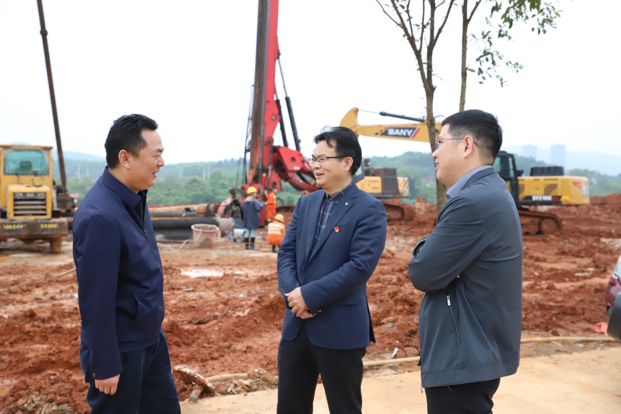 萬寶投資集團(tuán)董事長梁養(yǎng)賢(中)、總經(jīng)理徐業(yè)波(右),與項(xiàng)目所在地婁星區(qū)萬寶鎮(zhèn)負(fù)責(zé)人現(xiàn)場(chǎng)溝通對(duì)接
